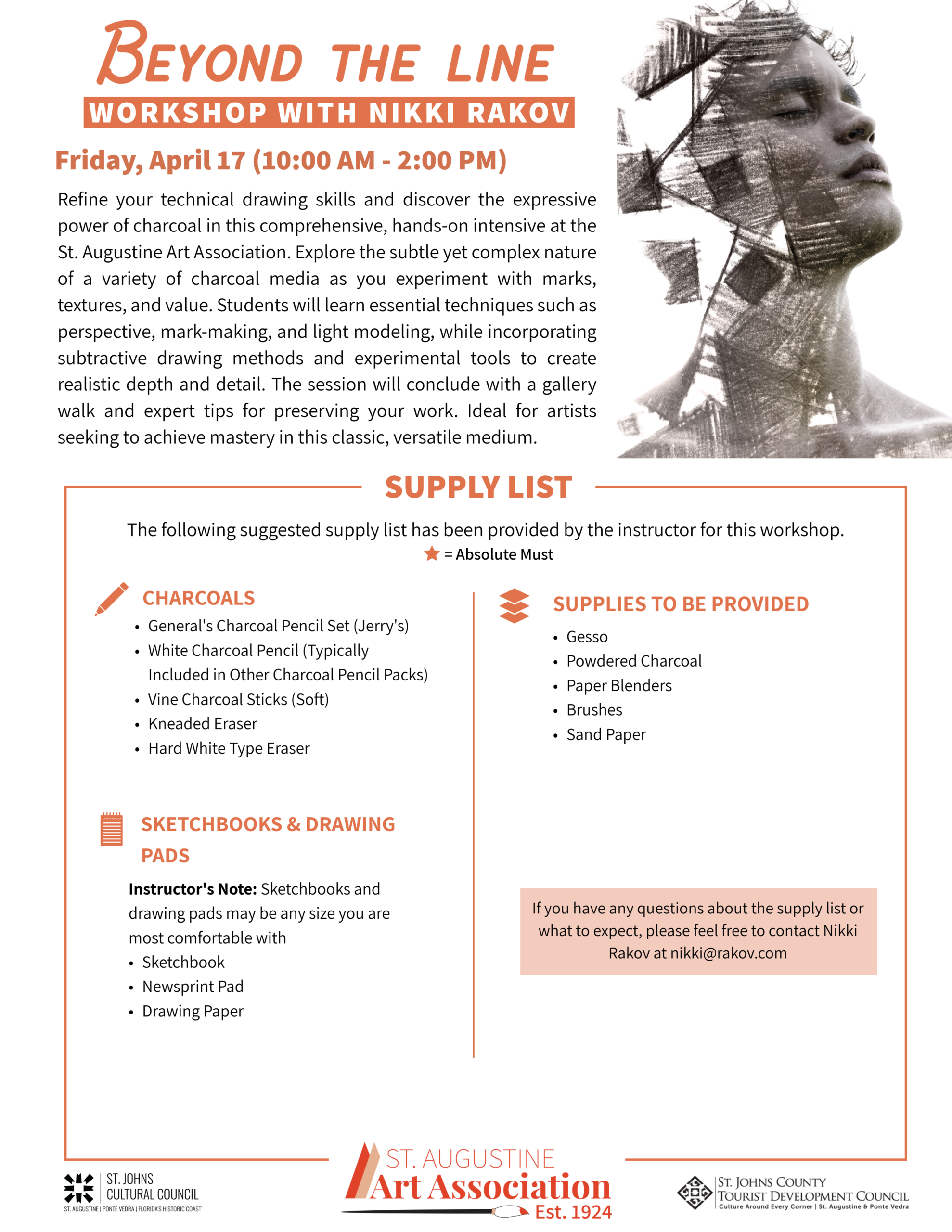 Refine your technical drawing skills and discover the expressive power of charcoal in this comprehensive, hands-on intensive at the St. Augustine Art Association. Explore the subtle yet complex nature of a variety of charcoal media as you experiment with marks, textures, and value. Students will learn essential techniques such as perspective, mark-making, and light modeling, while incorporating subtractive drawing methods and experimental tools to create realistic depth and detail. The session will conclude with a gallery walk and expert tips for preserving your work. Ideal for artists seeking to achieve mastery in this classic, versatile medium.