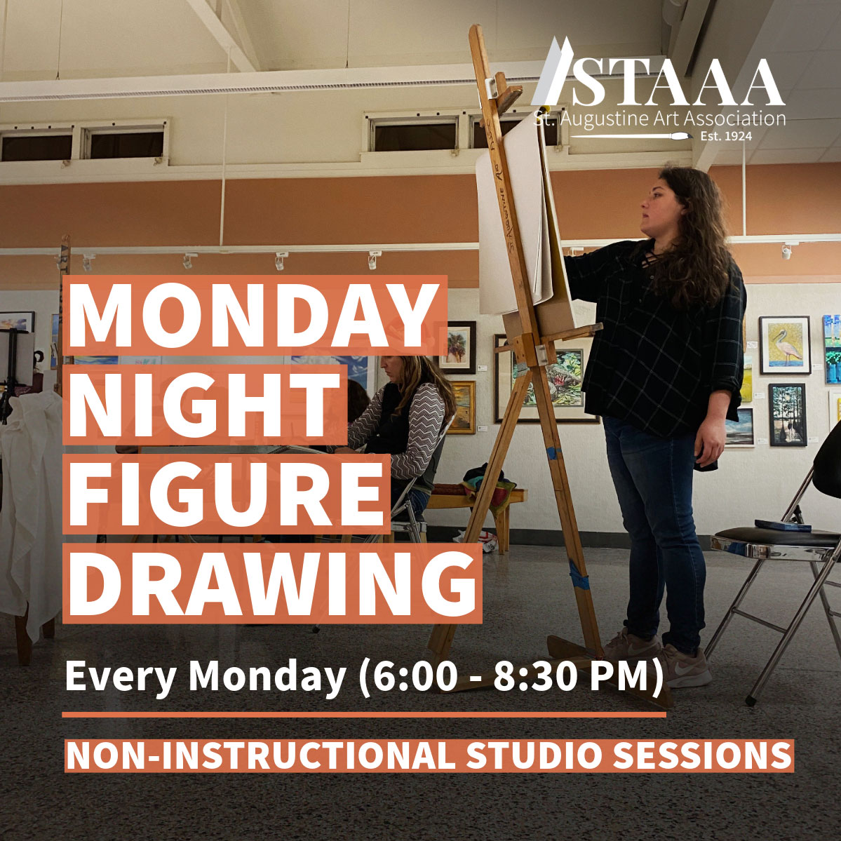 Every Monday night at 6pm, join the St. Augustine Art Association for Figure Drawing! This is a non-instructional intensive weekly studio session with a live model. Gestures, short and long poses offer a focused environment for studying the human form.