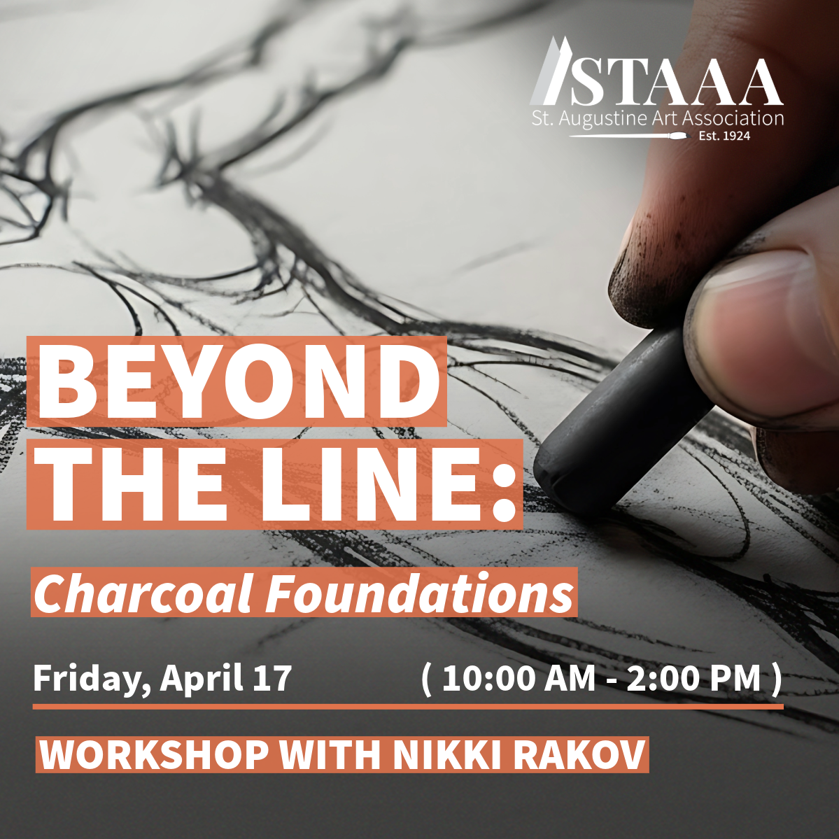 Discover the expressive power of charcoal in this hands-on workshop at the St. Augustine Art Association. Explore vine, compressed, and white charcoal as you experiment with marks, textures, and value scales. Learn essential techniques, from perspective and site measurement to subtractive drawing and highlighting, to bring a still life to life with depth and detail. Finish the session with a gallery walk and expert tips for preserving your work. Perfect for artists ready to build confidence and mastery in charcoal!