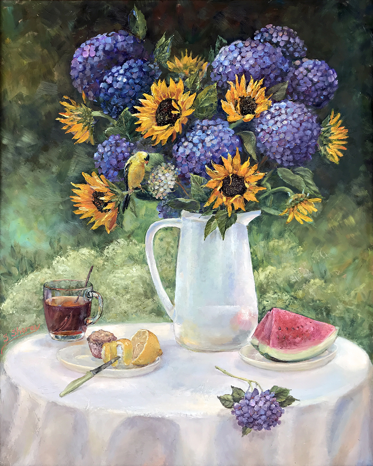 I intentionally placed the goldfinch next to a semi-circle of a young hydrangea cluster to trick your eye so the bird would look like a flower at first glance. Goldfinches are attracted to yellow-blossoming sunflowers and disguise themselves like them.