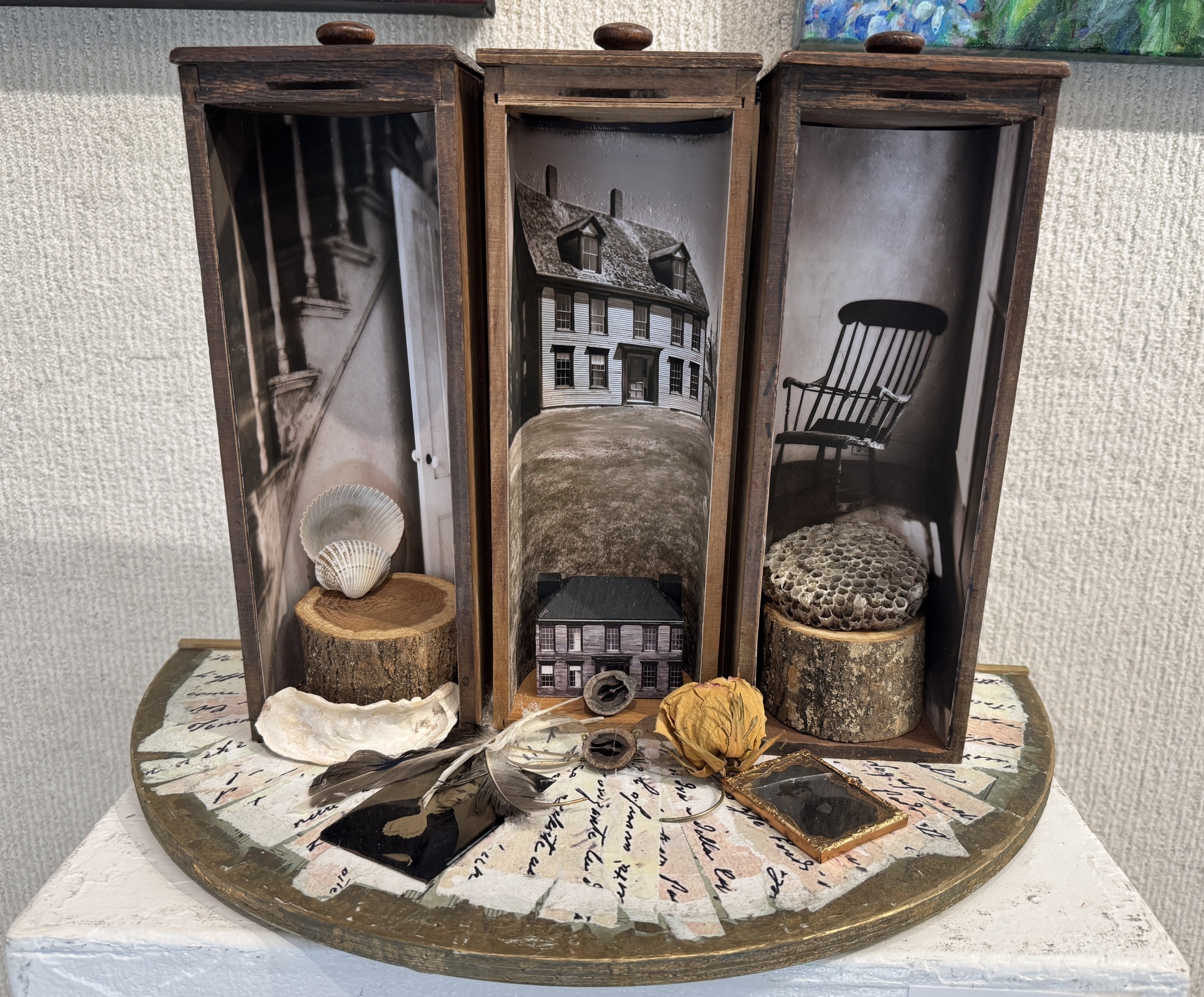 An homage to Andrew Wyeth. My assemblage was created using antique Singer Sewing Machine drawers, antique photos, shells, reading glasses, as well as my original photos taken at the actual Olson House, located in Cushing, Maine. This is the house where Christina Olson lived with her brother. Wyeth also used it as his studio. The Olson House was also the location for many of his most famous paintings, including his iconic “Christina’s World”