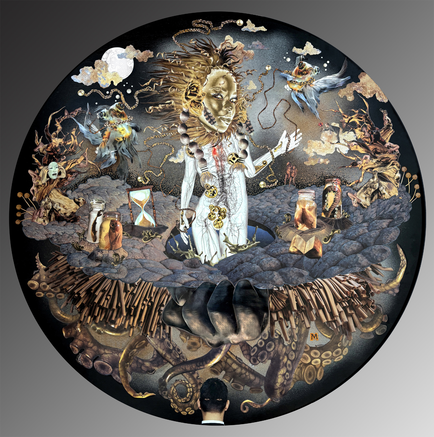 “This surreal, circular composition presents a luminous, goddess-like figure emerging from a fragile, floating world—surrounded by symbols of time, preservation, decay, and transformation. Suspended between sky and abyss, she rises from darkness held in an unseen hand, suggesting both creation and control. The piece explores the tension between beauty and ruin, power and vulnerability, asking whether we are witnessing rebirth—or the delicate balance before collapse.”