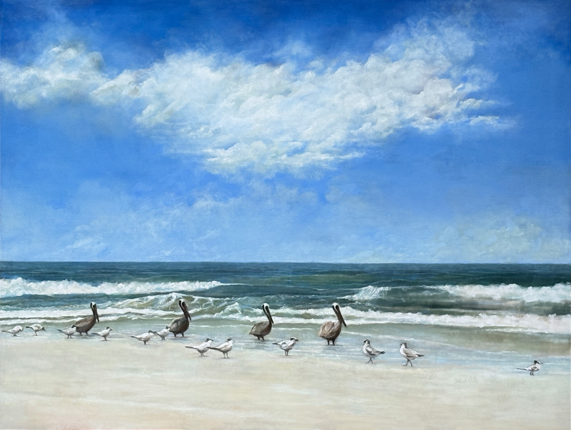 “The shoreline shifts with the tide. Less visible is the constancy of change itself. The pelicans and other shore birds offer counsel to those willing to receive it. Nature is my inspiration.”
