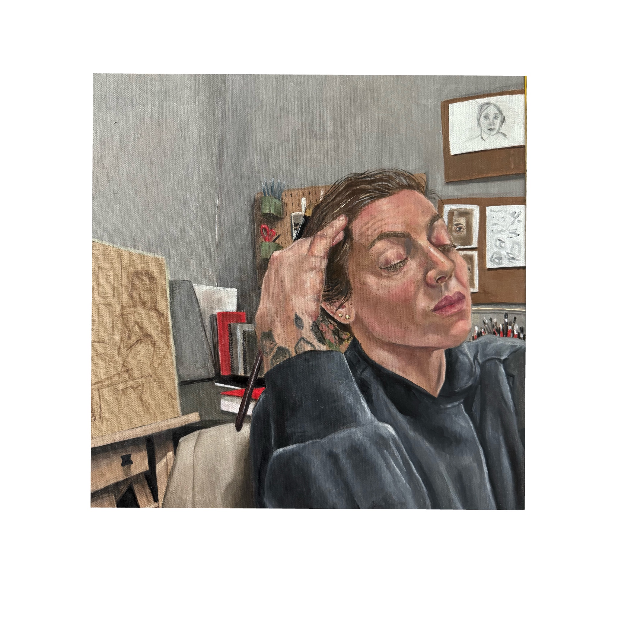 “This work reflects the moment of pause before true focus—when the “studio ghosts” begin to fade. Inspired by Philip Guston’s quote, the painting captures the tension between presence and absence, noise and silence. I am caught in an in-between state, waiting for the voices of teachers, peers, critics, and art history to leave the room. Only when they are gone can genuine concentration and intuition take over. The studio becomes both a physical and psychological space, where distraction slowly dissolves and the act of painting turns inward.”